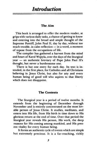 This treasury of selected passages from the writings and addresses of Pope John Paul II offers a chance for the modern reader, engaged in various daily tasks, to spend a few moments each day of the liturgical year contemplating the mystery and the example of Christ. Within these pages you'll find the Pope's reflections on the church, man, the family, the lives of the saints, the meaning of holidays, and the place of faith in daily life. His personal concerns are expressed in such topics as "Sharing with others," "To Be in Peace," "Consumer Society," "Family Prayer," and "The Great Divine Trial," about the meaning of his near-assassination. Through these passages of calm reflection each day, all will find a moment of peaceful repose from the occupations of life.