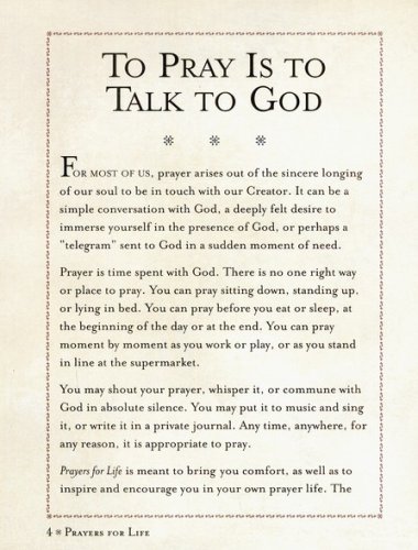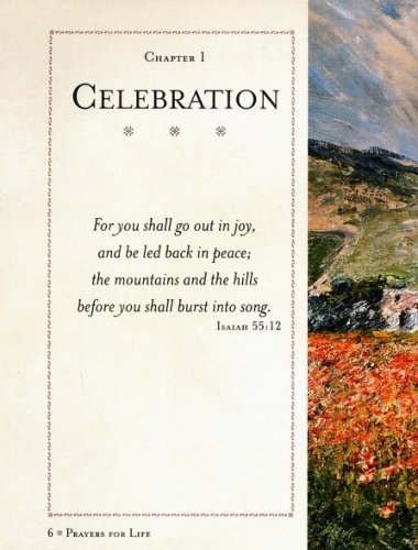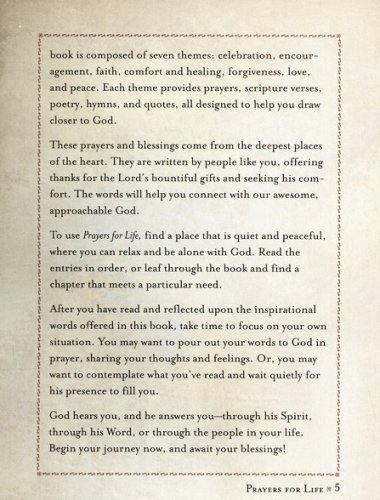 Prayers for Life is meant to bring comfort, as well as to inspire and encourage you in your prayer life. The book is composed of seven themes: celebration, encouragement, faith, comfort and healing, forgiveness, love, and peace. Each theme provides prayers, scripture verses, poetry, hymns, and quotations, all designed to help you draw closer to God. This prayer book features a padded hardcover binding, gilded page edges and a satin ribbon bookmark.