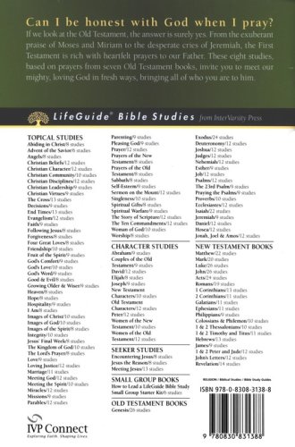 Can I be honest with God when I pray? If we look at the Old Testament, the answer is surely yes. From the exuberant praise of Moses and Miriam to the desperate cries of Jeremiah, the First Testament is rich with heartfelt prayers to our Father. These eight-session LifeGuide ® Bible Studyfrom Lynne M. Baab, based on prayers from seven Old Testament books, invite you to meet our mighty, loving God in fresh ways, bringing all of who you are to him. For over three decades LifeGuide Bible Studies have provided solid biblical content and raised thought-provoking questions—making for a one-of-a-kind Bible study experience for individuals and groups. This series has more than 130 titles on Old and New Testament books, character studies, and topical studies.