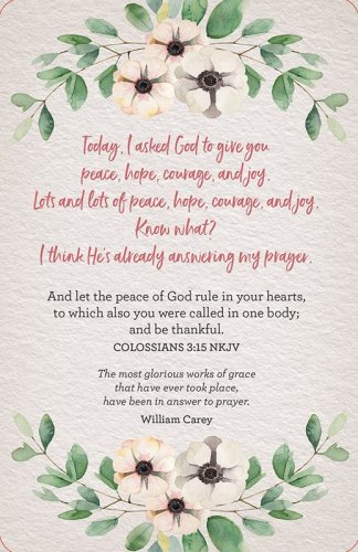 Prayer to share, 100 tear-out notes to pass along, all on the topic of Peace with Bible quotes6.75" x 4.25"; flex cover; floral illustrationsScripture and inspirational quote, and space on the back for you to jot a lineSurprise people, or intentionally share the good news of God's peace as you go through your dayWritten and designed by Cleere Cherry