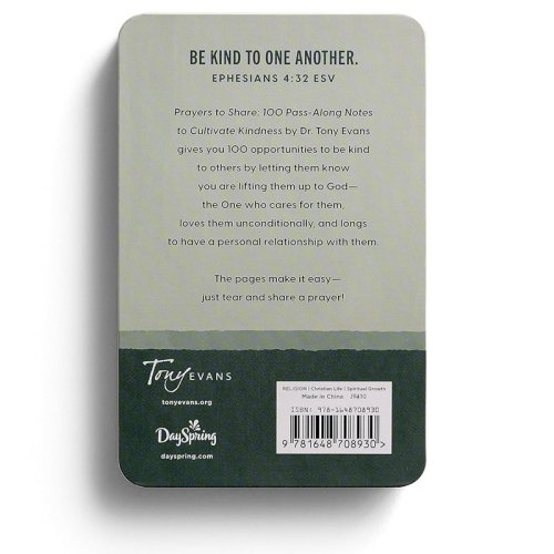 Dr. Tony Evans invites you to show kindness to the world around you through this new addition to DaySpring's best-selling Prayers to Share series. Prayers to Share: 100 Pass-Along Notes to Cultivate Kindness gives you 100 opportunities to be kind to others by letting them know you are lifting them up t o God, the One who cares for them, loves them unconditionally, and longs to have a personal relationship with them. An excellent way to start changing hearts and minds through acts of radical kindness. Each share a prayer card include select Scriptures, inspirational quotes, and a QR Code that leads to an inspiring video message from Dr. Tony Evans himself. If you wish, there's ample space on the back of each kindness note to write a personal handwritten note. These pages make it easy — just tear and share a prayer! Be kind to one another, tender-hearted, forgiving each other, just as God in Christ also has forgiven you. EPHESIANS 4:32 NASB