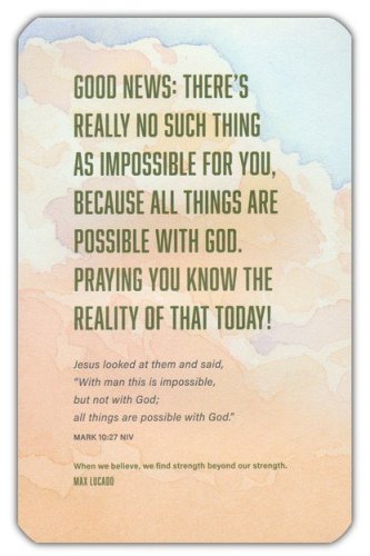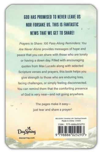 Prayers to Share: 100 Pass-Along Reminders You Are Never Alone from Max Lucado gives you 100 opportunities to share God's words of comfort, peace, and encouragement with others.Each tear-out is a reminder of God's promises for them, including a prayer, corresponding Scripture, and inspirational quote from Max Lucado.The back is left blank to add your own encouraging message of love for any moment!