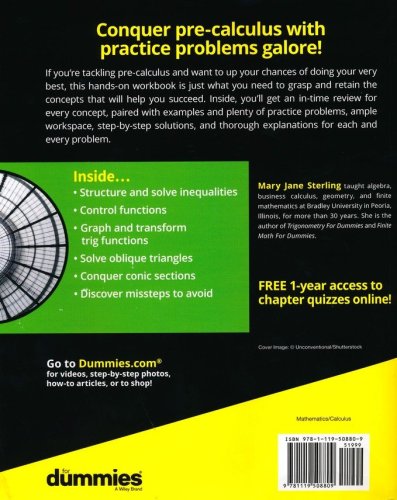 In Pre-Calculus Workbook For Dummies, you’ll also get free access to a quiz for every chapter online! With all of the lessons and practice offered, you’ll memorize the most frequently used formulas, see how to avoid common mistakes, understand tricky trig proofs, and get the inside scoop on key concepts such as quadratic equations.