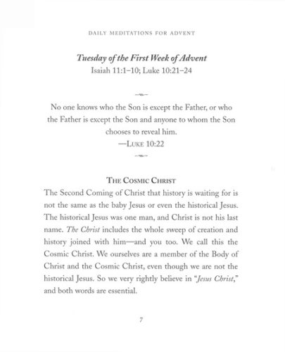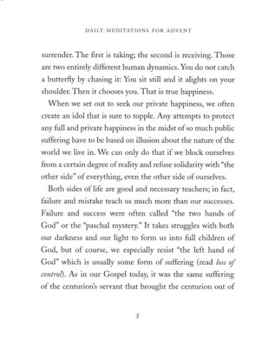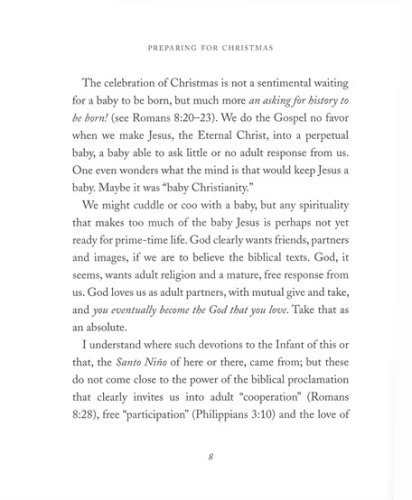 "Advent is not about a sentimental waiting for the Baby Jesus," Richard Rohr asserts. Advent is a time to focus our expectations and anticipation on "the adult Christ, the Cosmic Christ," who challenges us to empty ourselves, to lose ourselves, to surrender.