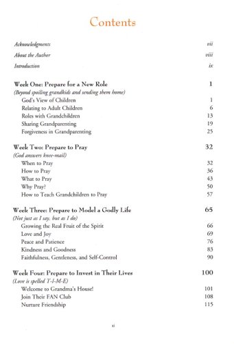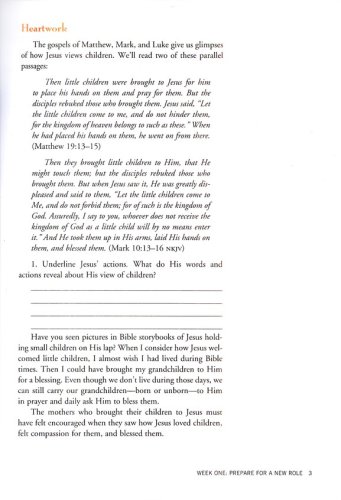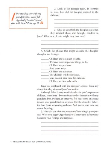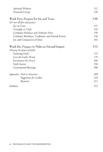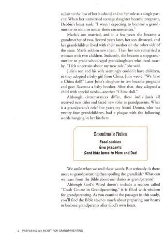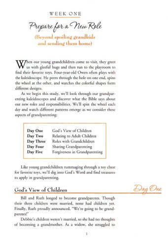 Preparing My Heart for Grandparenting provides six weeks of Bible-study lessons to help grandparents and those about to be grandparents. Each week contains five lessons with Scriptures, illustrations and insights from grandparents, a :grand-thought" takeaway, and a prayer. Weekends include: "grand-slam" ideas for activities with grandchildren, devotionals for grandparents, and Sunday prayers (for grandparents to pray for themselves along with scripture-based prayers to pray for their grandchildren). The study also features quotes from grandchildren about their prandparents.