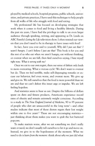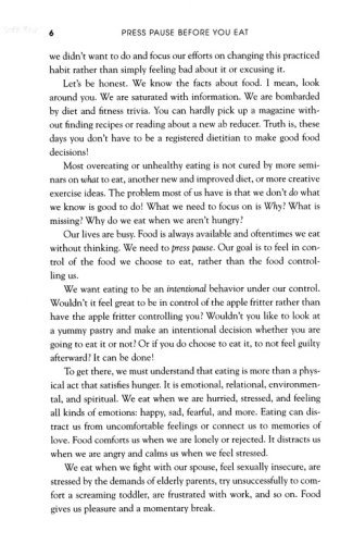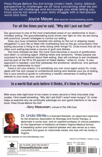 Press Pause Before You Eat and say goodbye to hurried and mindless eating. This ground-breaking book shines a light on the most overlooked area of our relationship with food: mindless and unintentional eating. It teaches readers to understand WHY they eat and provides practical, proven strategies to control eating. Diets treat symptoms; Press Pause Before You Eat deals with the root causes of unintentional eating and restores the joys of mindful eating. Busy schedules translate into eating on the run or skipping meals altogether. Life is not only filled with multitasking and hurried moments but on-the-go consumption. Eating becomes a thing to do while doing other things and all too often becomes a source of guilt and distress. The more stressed and busier people feel, the more food becomes a source of gratification, relief and a numbing agent, as well as a welcomed friend. In order to address the current obesity epidemic and struggles people have with their weight, a new approach is needed—one that addresses the emotional, relational, and spiritual side of the individual and his or her relationship to food.