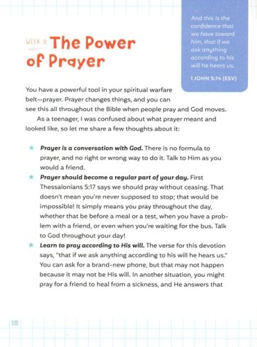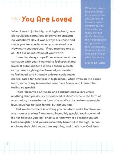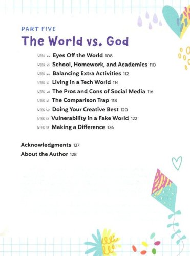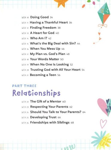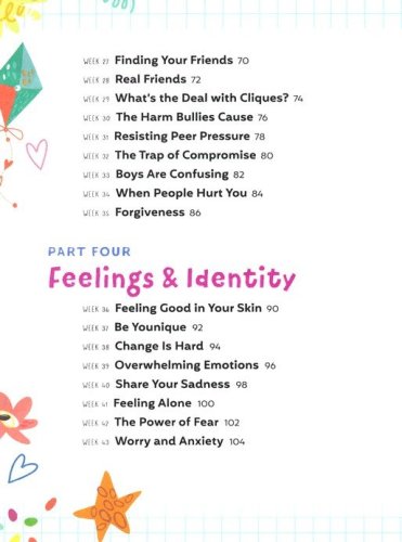 • 52 weekly devotions organized by themes like "Relationships," "Faith," and "Feelings and Identity" provide discussions of Scripture and how God’s word can help find solutions and security