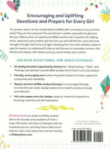 The preteen years can be complicated, and this conversational devotional helps girls find their voice and inner strength through God’s love and light. Brittany Rust, an experienced Bible teacher with a passion for helping teens know God and His Word, discusses and interprets Scripture in a way that makes it easy for kids to understand and speaks to everyday preteen concerns, like friends and cliques, self-esteem, privacy, social media, and crushes.