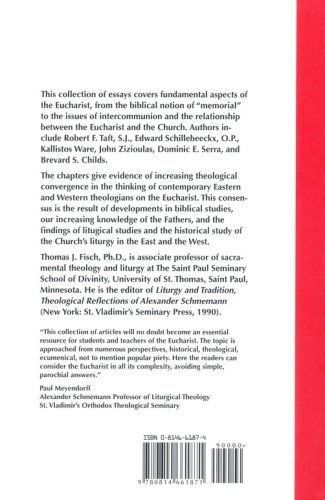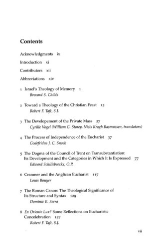 Essays and contributors are: Israel's Theology of Memory" by Brevard S. Childs; "Toward a Theology of the Christian Feast" by Robert F. Taft, S.J.; "The Development of the Private Mass" by Cyrille Vogel, William G. Storey, and Niels Krogh Rasmussen; "The Process of Independence of the Eucharist" by G.J.C. Snoek; "The Dogma of the Council of Trent on Transubstantiaion: Its Development and the Categories in Which It Is Expressed" by Edward Schillebeeckx, O.P.; "Cranmer and the Angelican Eucharist"; by Louis Bouger;"The Roman Canon: The Theological Significance of its Structure and Syntax" by Dominic E. Serra; "Receiving Communion – A Forgotten Symbol" by Robert F. Taft, S.J.; "Communion and Intercommunion" by Kalistos Ware; and "Eucharist and Catholicity" by John Zizioulas.