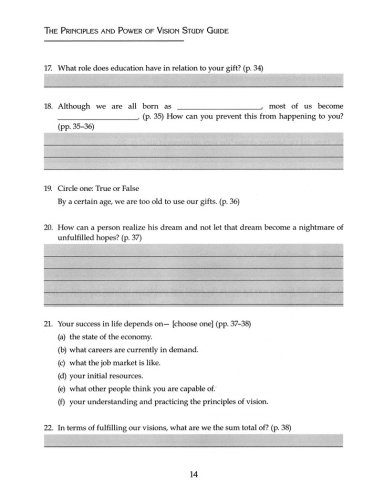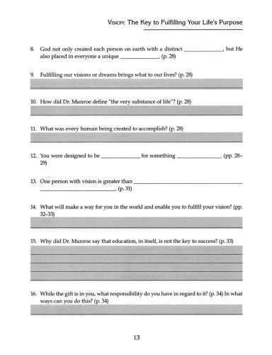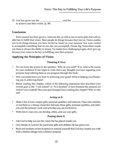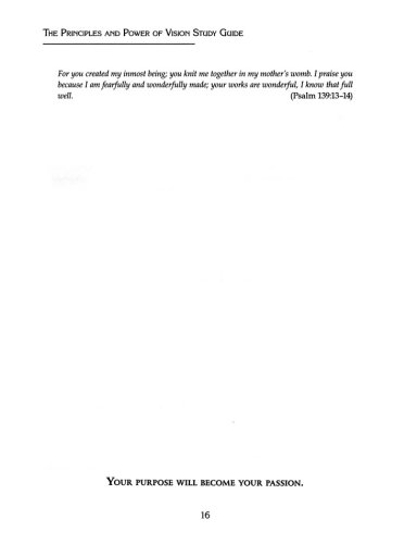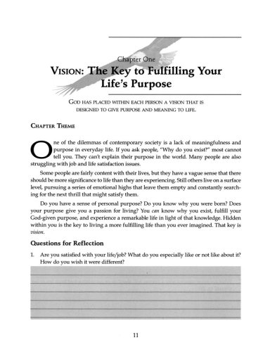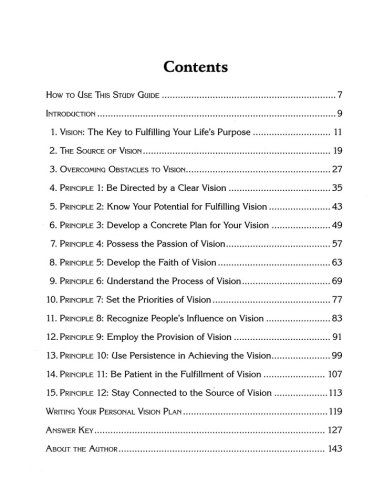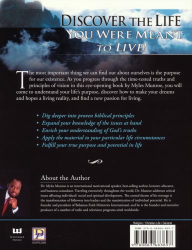 In this study guide companion to Myles Munroe’s eye-opening book, The Principles and Power of Vision, you will explore deeper insights into your purpose and thought-provoking questions for personal application to your life. Designed for either individual or group study, this guide will help you to: Dig deeper into proven biblical principlesExpand your knowledge of the issues at hand.Enrich your understanding of God’s truths.Apply the material to your particular life circumstances.Fulfill your true purpose and potential in life.The most important thing we can find out about ourselves is the purpose for our existence. As you progress through the time-tested truths and principles of vision in these pages, you will come to understand your life’s purpose, discover how to make your dreams and hopes a living reality, and find a new passion for living.