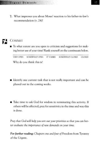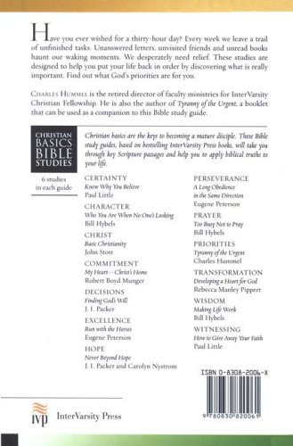 Have you ever wished for a thirty-hour day? Does your list of unfinished tasks–unanswered letters, unvisited friends, unread books–grow larger and larger each week? If so, you desperately need relief. Six studies drawn from Charles Hummel's Tyranny of the Urgent will help you put your life back in order by focusing on God's "to do" list instead of your own.