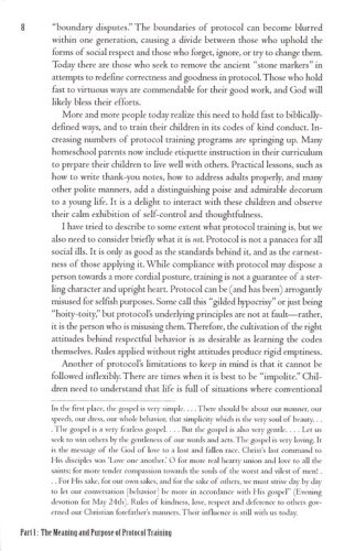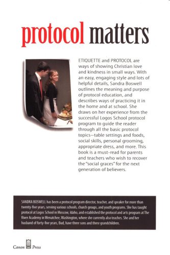 Etiquette and protocol are ways of showing Christian love and kindness in small ways. With an easy, engaging style and lots of helpful details, Sandra Boswell outlines the meaning and purpose of protocol education, and describes ways of practicing it in the home and at school. She draws on her experience from the successful Logos School protocol program to guide the reader through all the basic protocol topics – table settings and foods, social skills, personal grooming, appropriate dress, and more. This book is a must-read for parents who wish to recover the "social graces" for the next generation of believers.