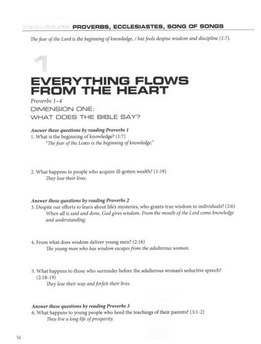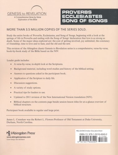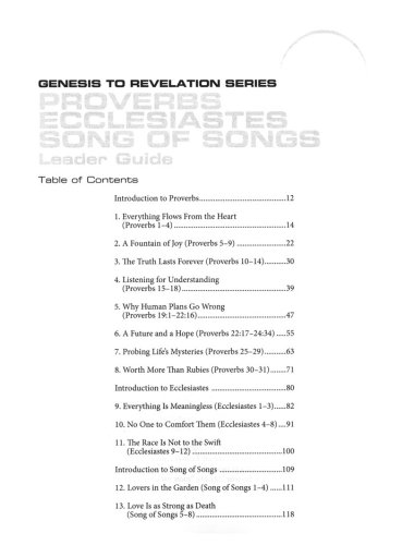What does the Bible say? What does it mean? How does it relate to my life? Genesis to Revelation, a comprehensive, verse-by-verse, book-by-book study of the Bible, will strengthen your understanding and appreciation of the Scripture by helping you engage on these three levels. Newly revised, these Abingdon classics are based on the NIV translation and are presented in an easy-to-read format. Each of the volumes includes thirteen sessions. Study the entire Books of Proverbs, Ecclesiastes, and Song of Songs in this comprehensive study beginning with a look at the springs of life in the Proverbs and ending with the Song of Songs' declaration that love is as strong as death. Some of the major ideas explored in this study are: the cost of getting involved, joy unlimited, the constancy of friendship, time to love and to hate, and the old and the new. The meaning of the selected passages is made clear by considering such aspects as ancient customs, locations of places, and the meanings of words. The simple format makes the study easy to use. Includes maps and glossary with key pronunciation helps. The Leader Guide includes the additional information you need to lead: A verse-by-verse, in-depth look at the Scriptures. Background material, including word studies and history of the biblical setting. Answers to questions asked in the Participant Book. Application of the Scripture to daily life situations. Discussion suggestions. A variety of study options. Practical tips for leaders to use.