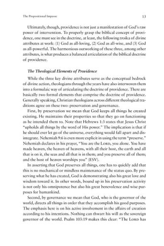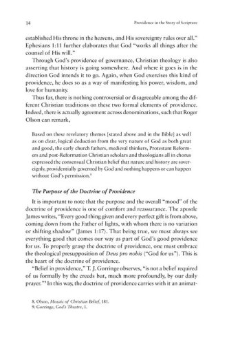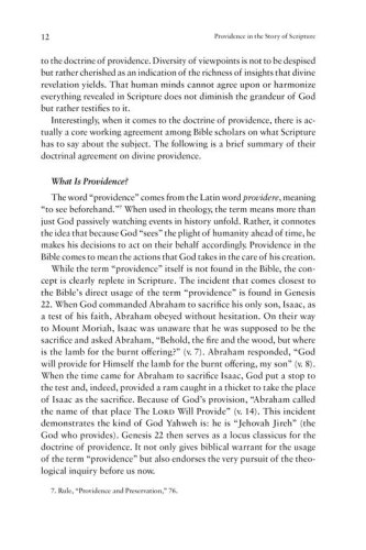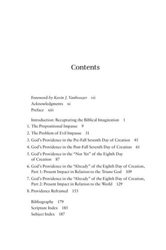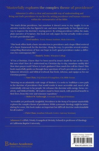Co begins with a brief introduction to providence to give students the "state of the question." He then explores the classical theme of the seventh and eighth days of creation as a helpful way to understand providence. He sets providence and human existence within the metanarrative of the Bible while explicating the doctrine in an overview fashion. Co demonstrates how the seventh and eighth days of creation bring clarity to traditional issues raised in systematic theology, such as preservation, governance, and concurrence; the problem of evil; and divine sovereignty and human free will.