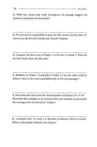 In this twelve-session LifeGuide ® Bible Study on Psalms teaches you how to relate to God as you pray your doubt, fears and anger. They show you how to respond to God in praise. Here you find the best place to explore who you are and what God means to you. For over three decades LifeGuide Bible Studies have provided solid biblical content and raised thought-provoking questions—making for a one-of-a-kind Bible study experience for individuals and groups. This series has more than 130 titles on Old and New Testament books, character studies, and topical studies.