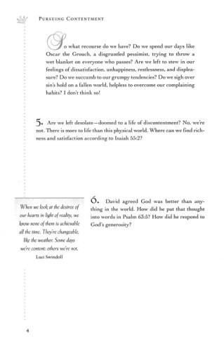 In Pursuing Contentment, you will explore what the Bible says about truecontentment how it is a skill to be learned. You can break old habits and patterns of thinking and choose to be grateful in all circumstances. You can say, like the apostle Paul, "I have learned in whatever state I am, to be content" (Philippians 4:11). You can cultivate contentment in your heart.