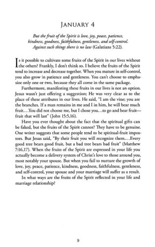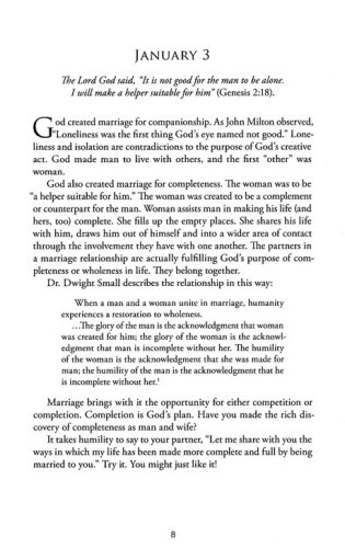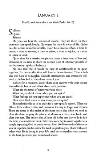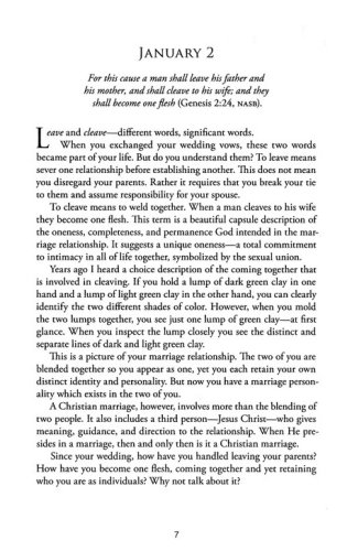 A couple will look forward to closing the doors on the frenzied world and taking turns reading the devotions. The Scripture verses and meditations guide them in applying God's Word to their lives and marriage, and the daily discussions will fill their relationship with a new expression of God's promises and an everlasting love toward one another.
