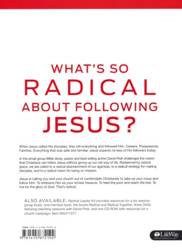 Radical Small Group Study – Member Book is a 6-session Bible study for adults by David Platt. Platt invites you to encounter what Jesus actually said about being his disciple, and then obey what you have heard. He challenges you to consider with an open heart how we have manipulated a God-centered gospel to fit our human-centered preferences. Combining the messages of Radical and Radical Together, this resource will help your congregation discover what could happen if the message of Radical were lived out by every member of your church. (6 sessions)