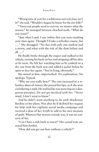 As killers begin to circle Mackenzie like sharks, it's clear to Gideon she's in over her head, and in light of his troubled past with her brother, he can't bring himself to ignore her perilous situation. Then a flood threatens the town, turning their investigation into a race to escape the raging waters and the wrath of a powerful kingpin who wants to sink them both.