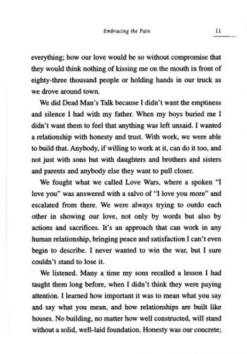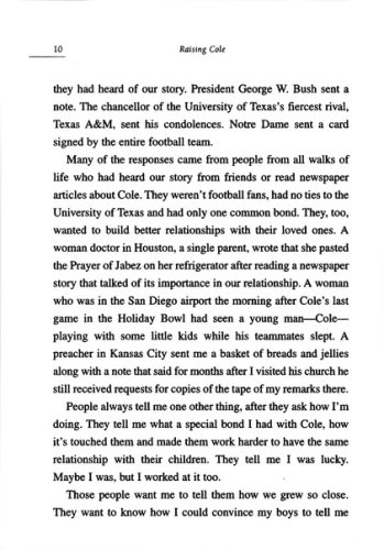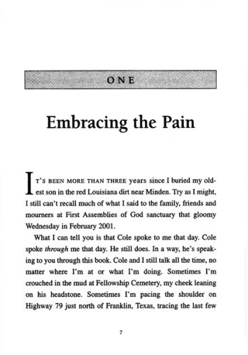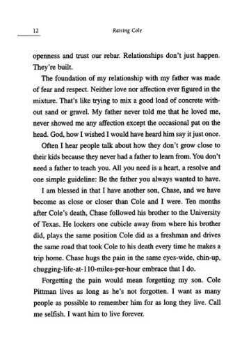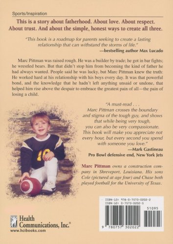 Marc Pittman, one of 16 children, is the son of a dirt-poor farmer who remains to this day the only man to ever knock Marc unconscious. But when he had a son, Marc became the father he had always wanted to have. When seven-year-old Cole asked him about beer, Marc Pittman put down his can never drank again. He told his boys everything, and they were honest with him in return. They unburdened their fears; told him their dreams; and even admitted their sins. Despite the fact that his sons were star football players, they felt no shame in holding their father's hand in public. People told him he was lucky to have the relationship he did with his children, but Marc Pittman knew the truth–it wasn't luck, he worked at it every day. And then his eldest son, Cole, was killed in a traffic accident on the way to a football practice at the University of Texas. This book is the story not just of how Marc Pittman dealt with this tragedy, but of the 21 years he lived with Cole and the lessons he learned about being a good father, a good friend, and a good man.