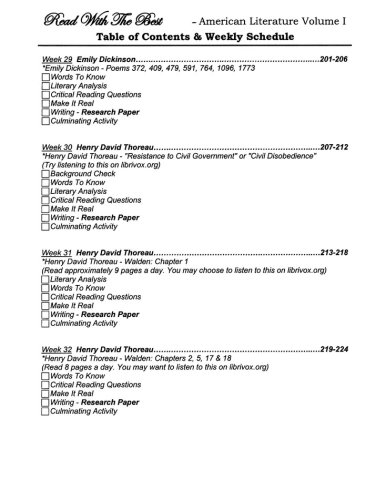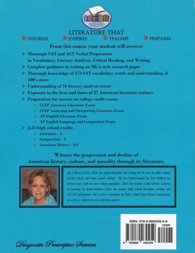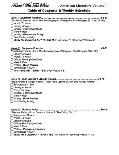 Focusing on actual skills rather than abstract rules, grammar is taught in the context of writing as students follow in the footsteps of literary giants. Each week features a new author: Columbus, Bradford, Winthrop, Bradstreet, Rowlandson, Mather, Edwards, Franklin, Adams, Paine, Jefferson, Wheatly, Irving, Emerson, Longfellow, Hawthorne, Poe, Dickenson, and other classic American authors each have a week's lessons that include five to six different areas: