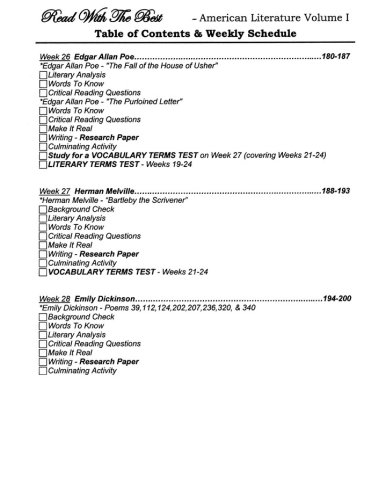"Background Checks" about the author"Words to Know" that need to be defined. "Literary Analysis" that covers literary terms that are tested every 6 weeks "Critical Reading" sections includes questions about each passage "Make it Real" applies learned skills to what students already know "Culminating Activities" that are given at the end of the week to help students master lessons. "Writing Assignments" that are given every two weeks and related to literary passages and authors; a research paper is given for the last half of the year. Word lists, tips for students with different learning styles, and other helps are included. 240 pages, softcover. Grades 8-12. This course is designed to take one year.Covers 1500-1860.