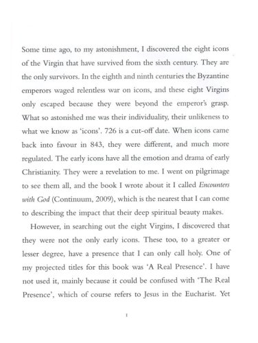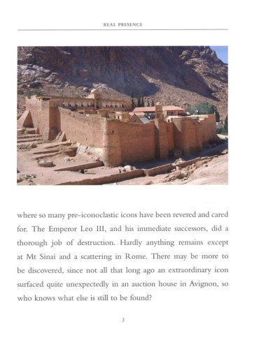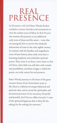 In Encounters with God Sister Wendy Beckett, a contemplative nun and beloved art commentator, traveled to remote churches and monasteries to view the earliest icons of Mary. In Real Presence she resumes this journey to see additional early icons of Jesus and the saintsicons that are among the few to survive the wholesale destruction of icons in the early eighth century. In contrast with the familiar and magnificent icons of later history, these early icons have a haunting simplicity and unfamiliar spiritual power. They come to us from a time closer to that of Christ, when faith was still alive with wonder and possibilities, and these images, a vehicle for prayer, can truly convey his real presence.