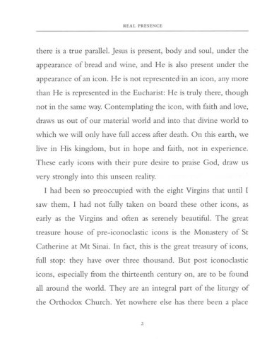 "Contemplating the icon, with faith and love, draws us out of our material world and into that divine world to which we will only have full access after death. On this earth, we live in His kingdom, but in hope and faith, not in experience. These early icons with their pure desire to praise God draw us very strongly into this unseen reality."