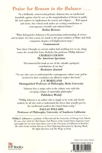 In his first book, Darwin on Trial, Berkeley law professor Phillip E. Johnson took on the heavyweights of science. And he got their attention, even provoking a response from neo-Darwinist Stephen Jay Gould in the pages of Scientific American. Now Johnson's back with a book that expands his critique from science to law, education and today's culture wars. Is God unconstitutional? Why is morality forced out of public school curriculum? Can Christians believe in God and evolution? Why aren't we getting anywhere in the debate over abortion? Will the Grand Unified Theory solve the riddle of the universe? Johnson dares to answer these and other tough, touchy questions. He reveals why naturalism (the philosophy that the material world is all there was, is and will be) has become "the established religious philosophy of America," supplanting Judeo-Christian belief. He shows how naturalism undergirds science, law, education and popular culture. And he argues that naturalism has even infiltrated the church–marginalizing opposition as irrational, and encouraging Christians to adopt a more "reasonable" stance. In Reason in the Balance, Johnson writes energetically and persuasively–chapter by chapter zeroing in on the chinks in the argument for naturalism. He explores nearly every acre of today's cultural battlefield: God, sex education, evolution, abortion, cosmology and particle physics, what our public schools should teach, the basis of law, the meaning of reason and a few other things that matter. Armed with biblical truth, common sense and a clear understanding of his foe, he steps out like David to fell the intellectual Goliath of our day.