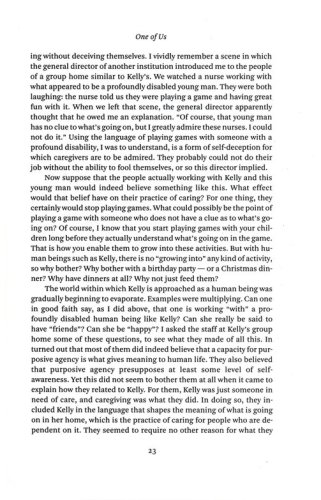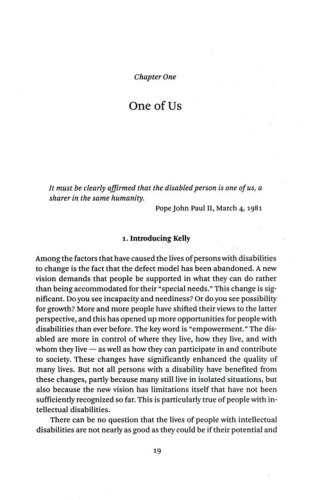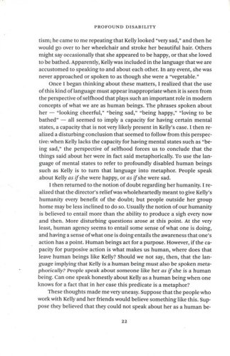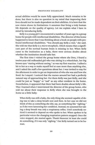 He acknowledges that, at first glance, this is not an unusual claim given the steps taken within the last few decades to bring the rights of those with disabilities into line with the rights of the mainstream. But, he argues, that cannot be the end of the matter, because the disabled are human beings before they are citizens. "To live a human life properly," he says, "they must not only be included in our institutions and have access to our public spaces; they must also be included in other people's lives, not just by natural necessity but by choice."