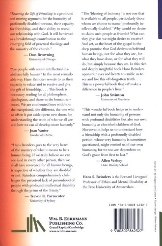 Receiving the Gift of Friendship consists of three parts: (1) Profound Disability, (2) Theology, and (3) Ethics. Overturning the "commonsense" view of human beings, Reinders's argument for a paradigm shift in our relation to people with disabilities is founded on a groundbreaking philosophical-theological consideration of humanity and of our basic human commonality. Moreover, Reinders gives his study human vividness and warmth with stories of the profoundly disabled from his own life and from the work of Jean Vanier and Henri Nouwen in L'Arche communities.