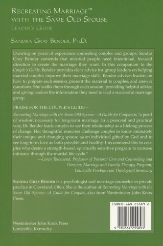 Drawing on years of experience counseling couples and groups, Sandra Bender contends that married people need intentional, focused direction to create the marriage they want. In this companion to the Couple's Guide, Bender provides clear advice for group leaders on helping married couples improve their marriage skills. Bender advises leaders on how to prepare for each session, present the material to couples, and answer questions. She walks them through each session, providing helpful advice and giving leaders the information they need to lead a successful marriage group.