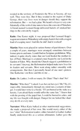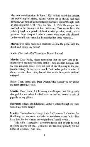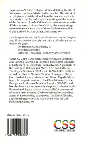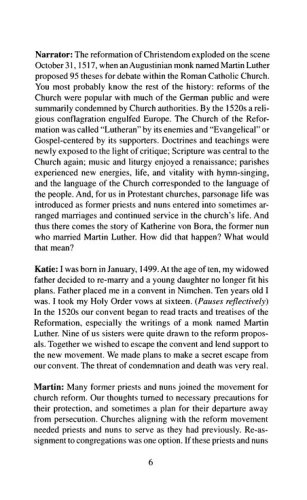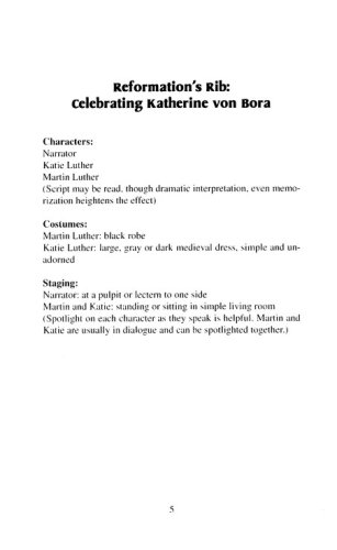 "Reformation's Rib "is a chancel drama detailing the life of Katherine von Bora (Martin Luther's wife). The historical script gives an insightful look into the husband and wife relationship that helped shape the writings of the founder of the Lutheran church. Originally written to celebrate the 500th anniversary of von Bora's birth, this easy-to-stage presentation calls for a cast of three: Katherine von Bora (Katie Luther), Martin Luther, and a narrator.