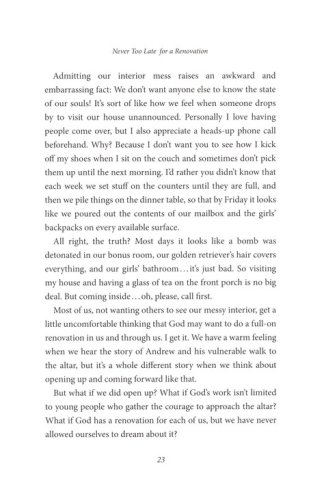Never Too Late for a RenovationIt Starts with TearsWhat to Know Before You BuildWhen Others Don't Like Your PlansInviting Others to Come HomeThe Big Reveal