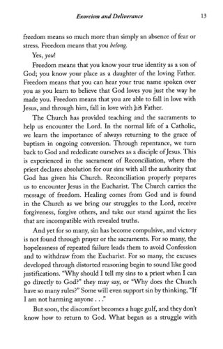 Lozano's "Unbound" Model, based on three decades of experience in deliverance ministry, builds a bridge between the sacrament of Reconciliation and exorcism. People only very rarely need exorcism an official ministry of the Church yet can still have difficulty receiving the freedom offered by the sacrament. Deliverance closes this gap. It offers troubled believers a way to get free from the influence of evil spirits.