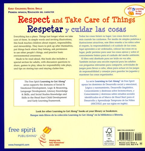 Everything has a place. Things last longer when we take care of them. Showing respect, responsibility, and stewardship are social skills that even young children can relate to—because they have things they value. In both English and Spanish, this book encourages children to pick up after themselves, put things back where they belong, and ask permission to use things that don’t belong to them. It also teaches simple environmental awareness: respecting and taking care of the earth. Includes a special section for adults with discussion questions, games, responsibility role plays, and tips on storing toys and staying clutter-free.