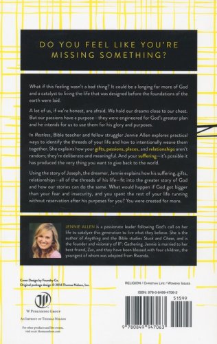 Using the story of Joseph, the dreamer, Jennie explains how his suffering, gifts, relationships—all of the threads of his life—fit into the greater story of God and how our stories can do the same. What would happen if God got bigger than your fear and insecurity, and you spent the rest of your life running without reservation after his purposes for you? You were created for more.