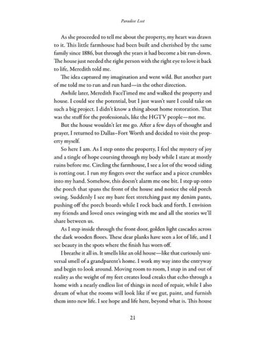 Every one of us has broken places inside. Places in our souls where the dust gathers or the wind whistles through. Every one of us needs restoration. Photographer and portrait artist Meshali Mitchell is no different. Though, in her case, she also had a farmhouse to restore to its former glory.