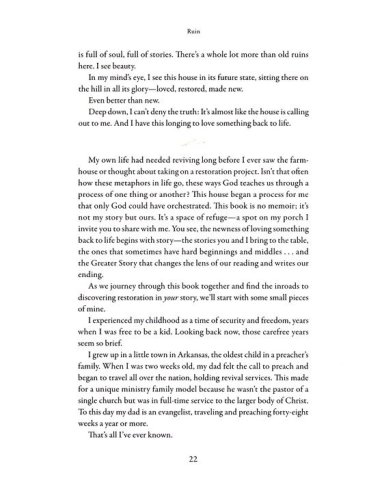 In this beautiful, full-color book, Meshali shares the inspiring story of how the Lord drew her out from behind the camera to embark on an unlikely home renovation in the midst of her own difficult journey to healing. As she handed God the keys to every room in her heart, Meshali learned lessons of patience, perseverance, and self-forgiveness that paralleled the physical restoration of the building around her. With lyrical prose steeped in Scripture and practical tools, she shows you how to apply those same discoveries to your own life as you ask God to heal, restore, and empower you to live abundantly.