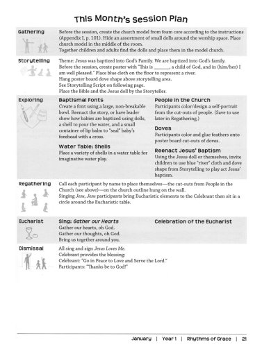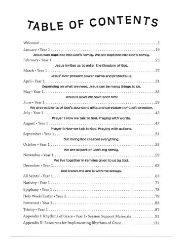 The whole Rhythms of Grace curriculum consists of a 3-year syllabus of distinct scripture-based session plans. This volume, Year 1, includes complete plans for 12 monthly sessions and 6 feast sessions, as well as the background and support material needed to establish and conduct a successful program.