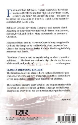 For more than 270 years, readers of all ages have been fascinated by the story of a young fool who ran away from wealth, security, and family for a rough life at sea—and came to his senses too late, alone on a tropical island. Alone, except for cannibals and God. Robinson Crusoe’s adventure takes place on an island near the Orinoco River of Venezuela. Adjusting to the primitive conditions, he learns to make tools, shelter, bread, clothes, baskets, and canoes. More importantly, he becomes a Christian. Modern editions often leave out Crusoe’s long struggle with God and his slow transformation as he studies and applies God’s Word. As part of P&R’s Classics for Young Readers series, Kathryn Lindskoog has edited Robinson Crusoe for today’s reader, faithfully preserving every detail of the original story. Full-page illustrations are featured to add to your reading pleasure.