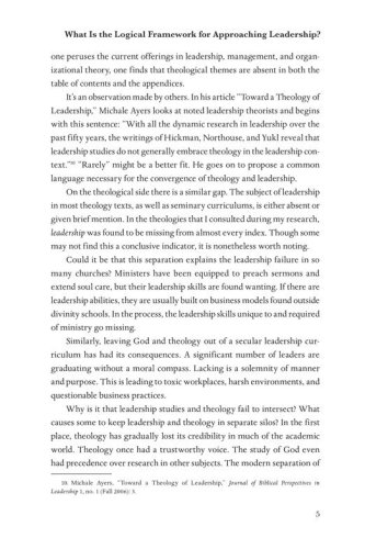 Most leadership books today revolve around the concepts of motivation, inspiration, empowerment, and teamwork. Helpful as these themes might be, they miss something more fundamental. Leadership needs a theological foundation, that will be useful for shaping the undergirding principles, and evaluating current leadership theories and practices. We need to view leadership from the vantage point of God.