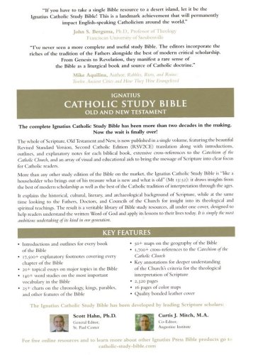 More than any other study edition of the Bible on the market, the Ignatius Catholic Study Bible is "like a householder who brings out of his treasure what is new and what is old" (Mt 13:52). It draws insights from the best of modern scholarship as well as the best of the Catholic tradition of interpretation through the ages.
