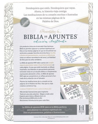 La Biblia de Apuntes, Edición Ilustrada, combina 2 tendencias de hoy: El uso de la Biblia como diario y como libro de colorear para adultos. Con ilustraciones únicas incluidas en cada página, lectores, ilustradores y personas que toman notas, tendrán la oportunidad de aprender a adentrarse el texto bíblico de una manera novedosa. Este diseño excepcional ofrece un balance único para todos, desde artistas de larga trayectoria hasta personas con dificultad para crear, permitiendo a través de la creatividad y la personalización guiada de la experiencia de la lectura de la Biblia. Con filigrana, citas bíblicas e imagines únicas, estas ilustraciones esperan ser llevadas a la vida.