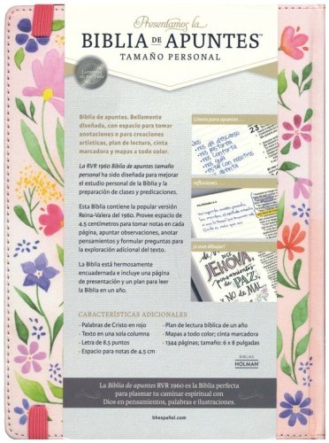 Esta Biblia contiene la popular versión Reina-Valera del 1960. Provee espacio de 4.5 centímetros para tomar notas en cada página, apuntar observaciones, anotar pensamientos y formular preguntas para la exploración adicional del texto.