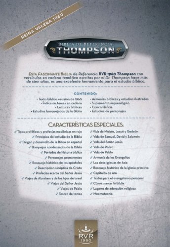 La Biblia de Referencia Thompson, versión Reina-Valera 1960, es sin lugar a dudas la Biblia más completa que se puede encontrar. Es prácticamente una biblioteca de referencia bíblica con más de 7,000 nombres, lugares y temas y más de 100,000 referencias analizadas y clasificadas de acuerdo con los conceptos. Las ayudas marginales están "encadenadas" a ocho secciones al final de la Biblia, donde la profusión de detalles es superior a cualquier otra Biblia publicada. Está diseñada para ayudar al lector a identificar miles de temas significativos, conceptos, ideas y personajes bíblicos, e investigar las referencias de estos temas a través de toda la Biblia. Es un sistema completo, fácil de entender y de usar. Esta es la Biblia ideal para el pastor, el maestro de Escuela Dominical, el laico y el estudiante.