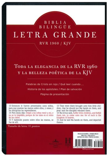 A bilingual Bible, Spanish and English, large print, that combines the elegance of the Reina Valera 1960 with the poetic beauty of the King James.