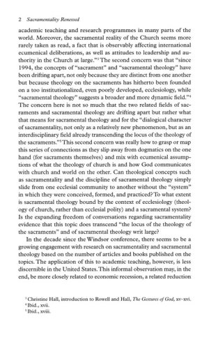 Tracing developments in sacramental theology over the past twenty-five years, this study explores a growing ecumenical dynamism in both the academic study of sacramentality and its centrality in pastoral applications. But how does ecumenical excitement in a renewed discovery of sacramental theology fit with different theologies of church and different pastoral beliefs and practices? How does the universality of academic accessibility in the form of an expansive ecumenical sharing of perspectives meet the particularities of pastoral reality and ecclesial polity?