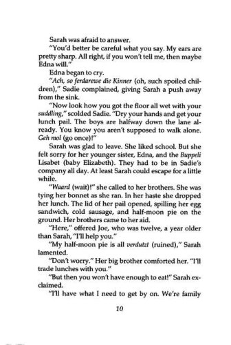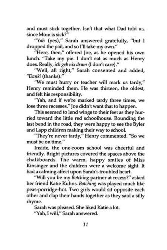 At the house raising for Sara's family, the head carpenter's son Rudy Kemp notices Sarah. He gives her rides home after youth singings. Later, Sara keeps company with Mahlon Mast. Eventually they are baptized an them married in the Amish church. Recommended for ages 8 to 12.