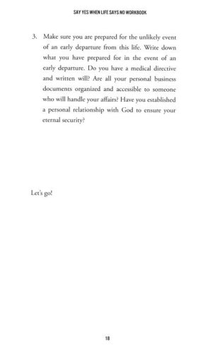 Turn life’s nos into yeses The companion workbook to Say Yes When Life Says No is an exciting and encouraging 31-day guide that restarts dreams and goals that seem out of reach. With insightful anecdotes and moving biblical references from Rev. Dr. DeForest Soaries, this hands-on workbook encourages us to dig in and work toward setting personal goals, completing daily action items, and gaining clarity on reflective questions that will ignite our potential and move our response from "no" to "yes!" You will address key areas like: